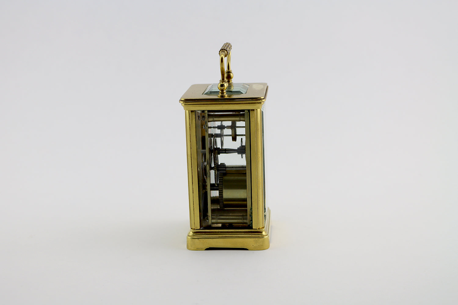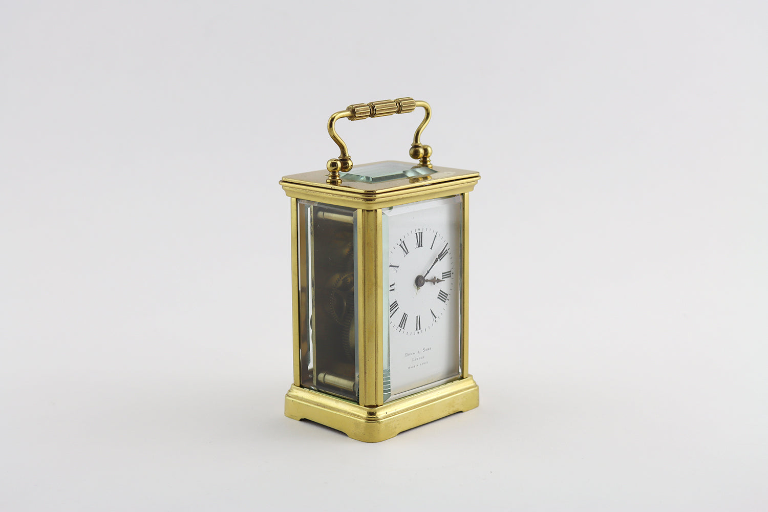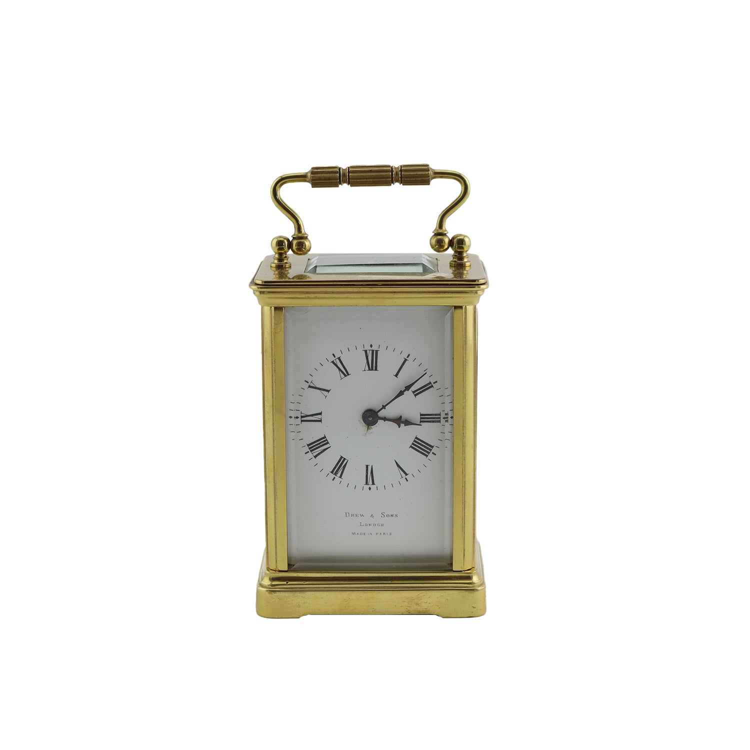 English brass carriage clock with French movement, the white dial with roman numerals marked "Drew & Sons London Made in Paris", complete with integrated winder key as well as key for setting time, with hinged handle, late 19th century. The firm of retail jewellers Drew and Sons was based at Piccadilly Circus from 1887 until 1914 when they moved to premises in Regent Street. They also had premises at Leadenhall Street in London from 1888-1914 and also at Kings Road in Brighton from 1894.