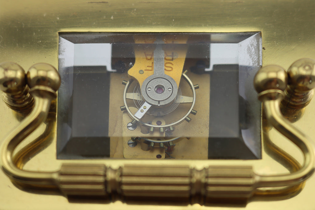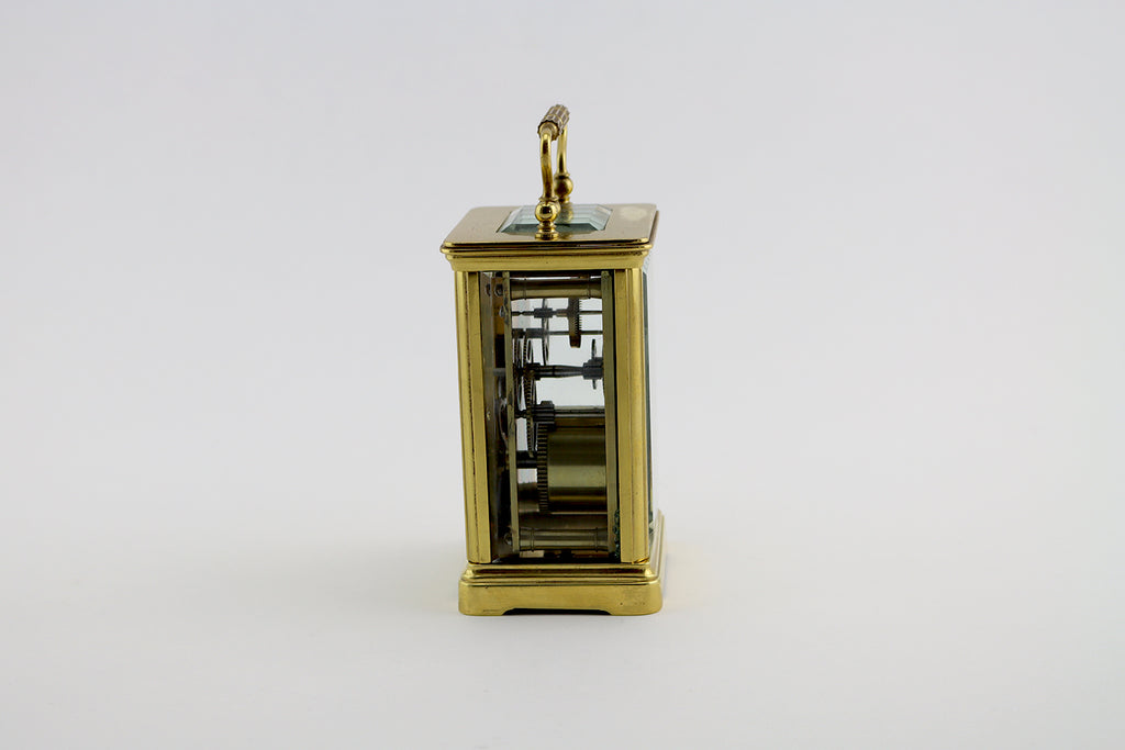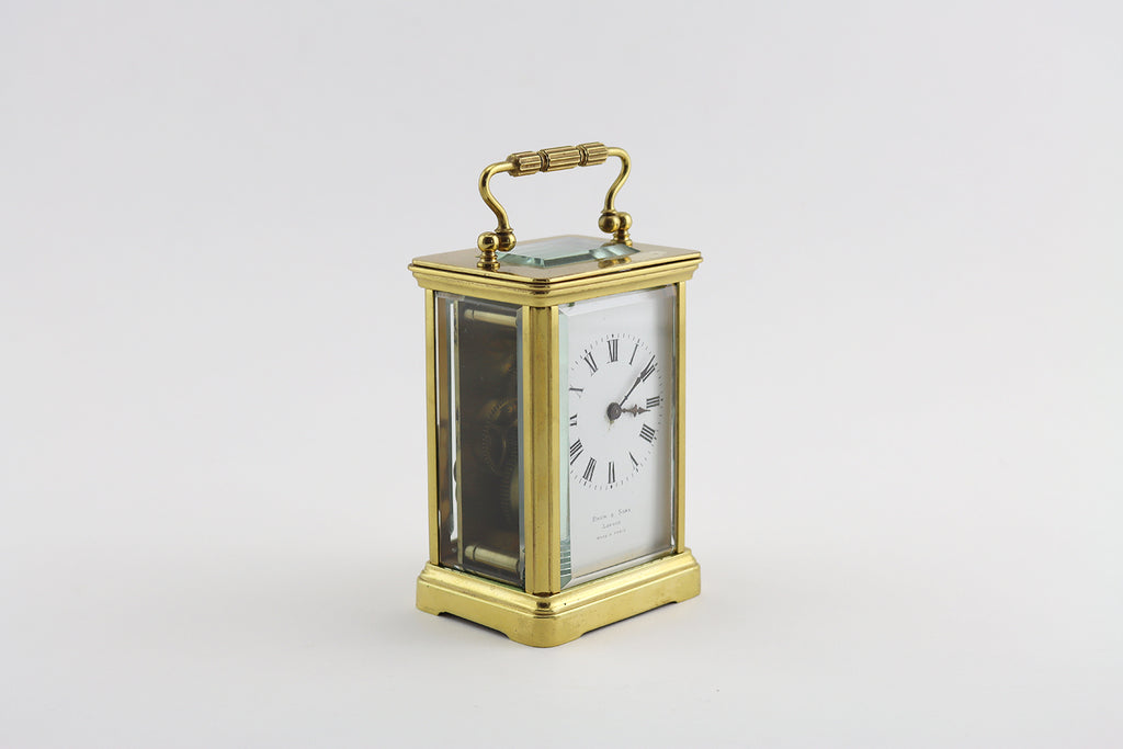 Carriage clocks, or ‘Officers’ clocks as they are sometimes known, were first developed for Napoleon Bonaparte between 1798 and 1812 by Abraham-Louis Breguet. The clock cases are simple in form for ease of transport and are usually made of plain or gilt brass in a rectangular shape with a carrying handle and inset with glass, or on occasion enamel or porcelain panels. The balance spring used to drive the clock replaced the pendulum needed in earlier larger bracket clocks. These small spring-driven clocks were designed for travelling and sometimes came encased in leather or leather-covered wood cases which would protect the clock in transport. It is rare today to find the clock and leather cover intact as time has often deteriorated the leather or the clock and cover have become separated over time. In the past carriage clocks were a traditional gift to retiring or long-serving staff.