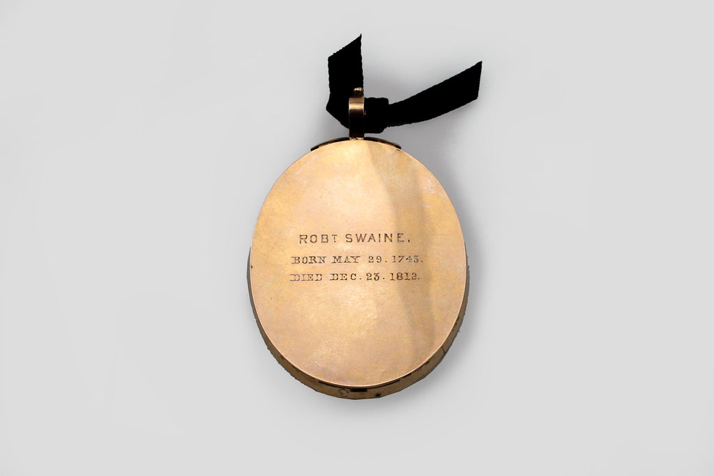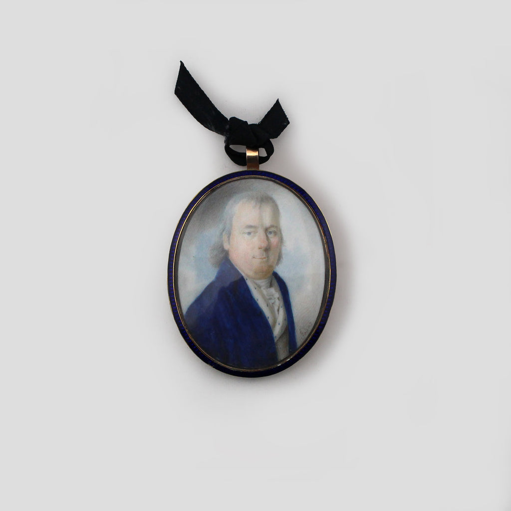 Georgian miniature portrait, signed lower right "Johns", in gold frame (10 karat) surrounded by blue enamel, inscribed on reverse "ROB T SWAINE BORN MAY 29, 1745, DIED DEC 23, 1812", English late 18th centurySize: 2 ½ h x 1.6 w x ¼ dJ19218