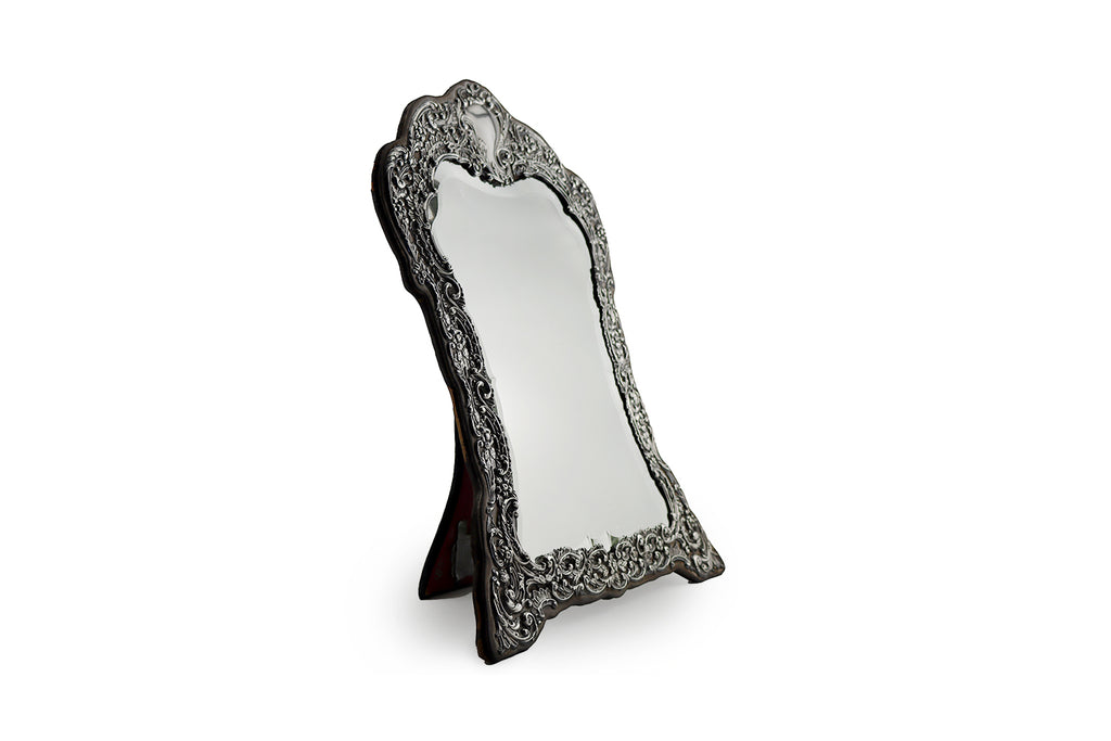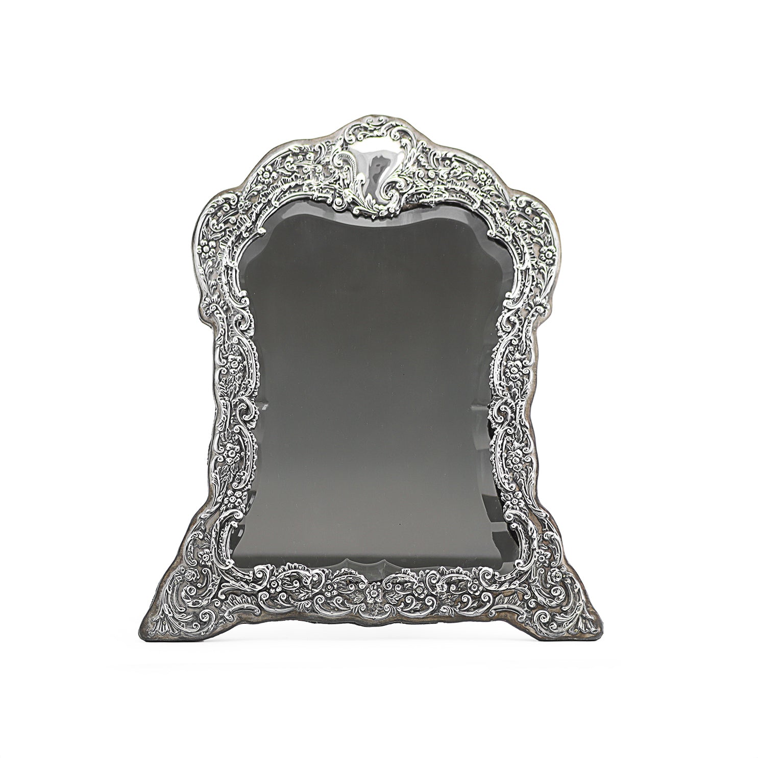 Ornate silver frame dressing mirror, with bevelled mirror, circa 1900 possibly BritishSize: 18 3/4 h x 15 wC21354