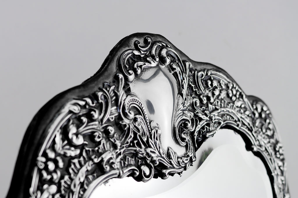 Ornate silver frame dressing mirror, with bevelled mirror, circa 1900 is backordered and will ship as soon as it is back in stock.