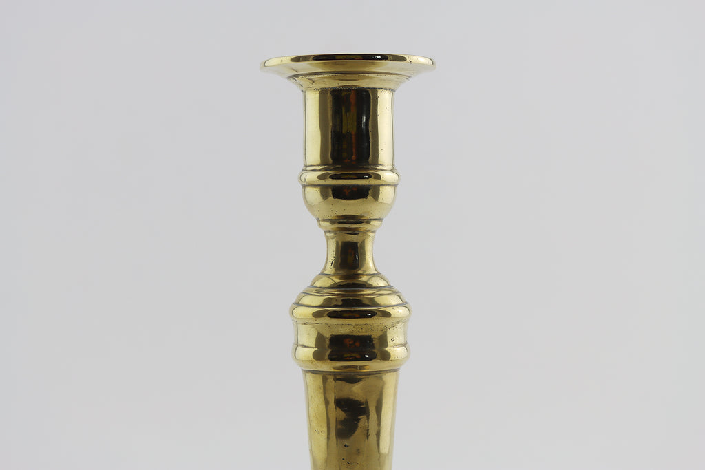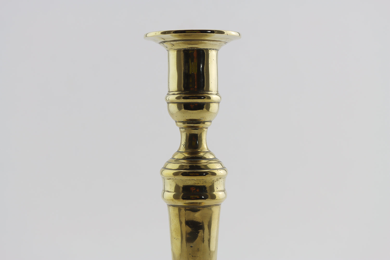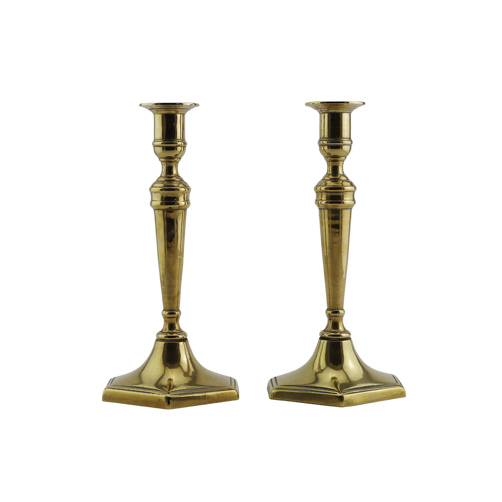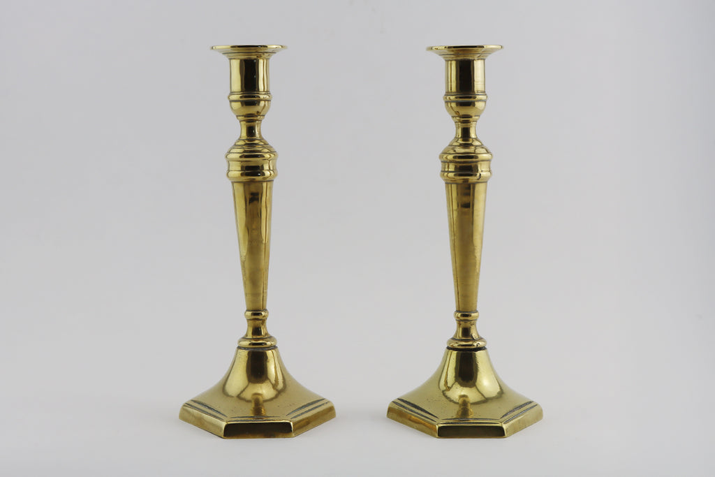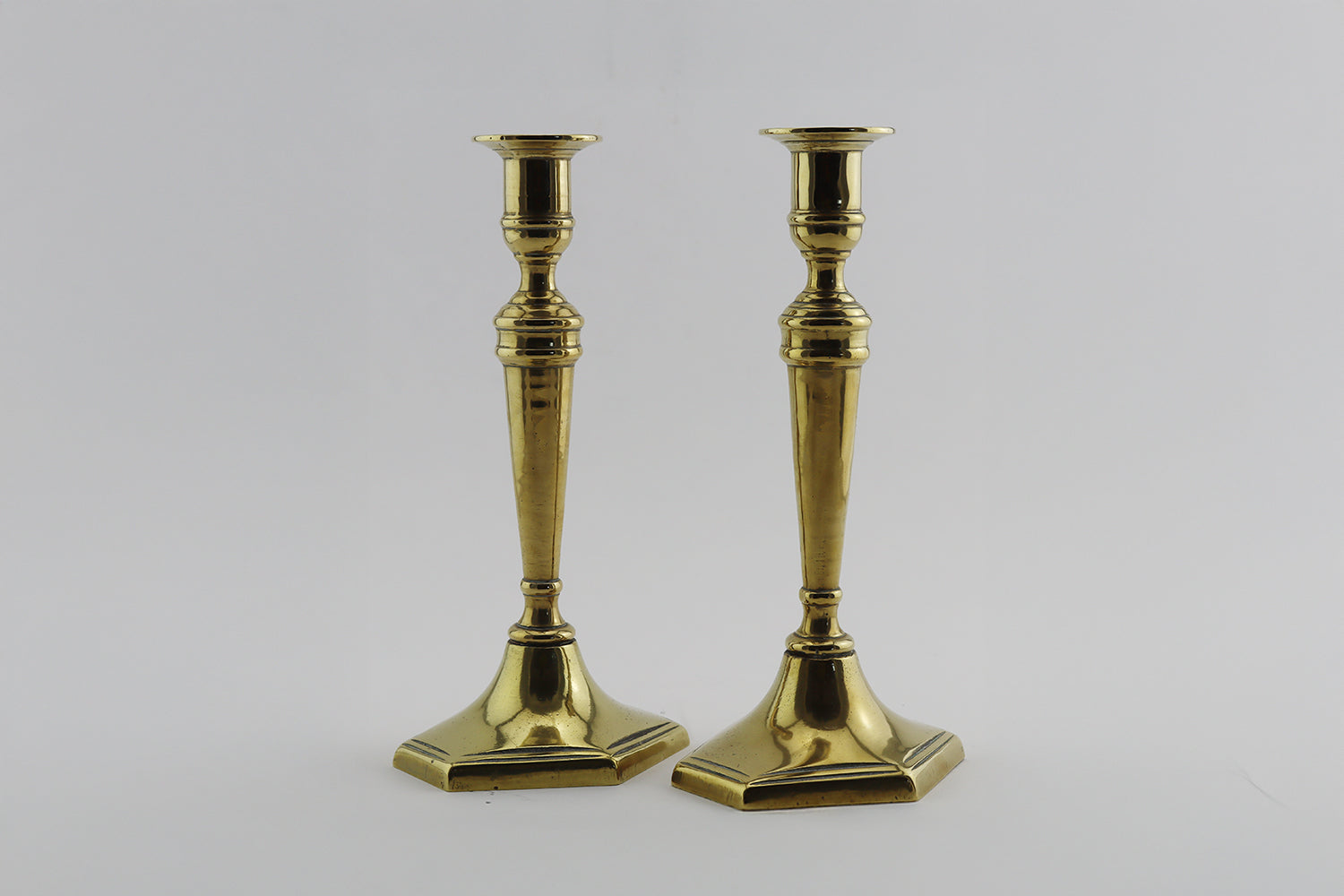 Pair of Georgian brass candlesticks, urn shaped socket with wide flange, the plain tapering column on a hexagonal base, English circa 1780-1800Size: 9.63 h x 2 w x 4.5 dG21409