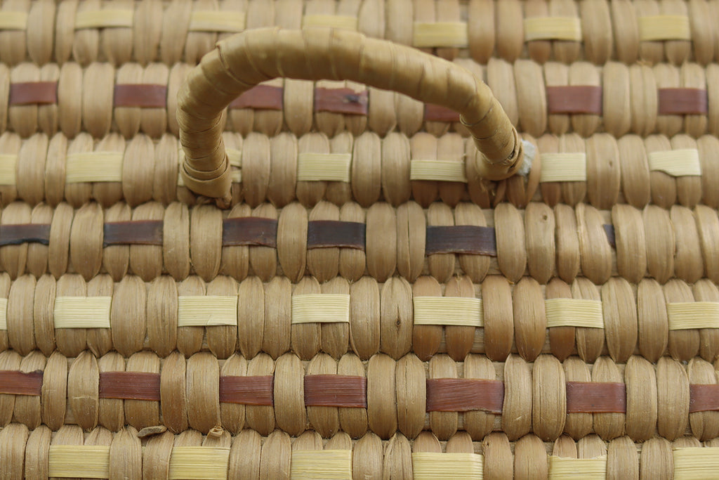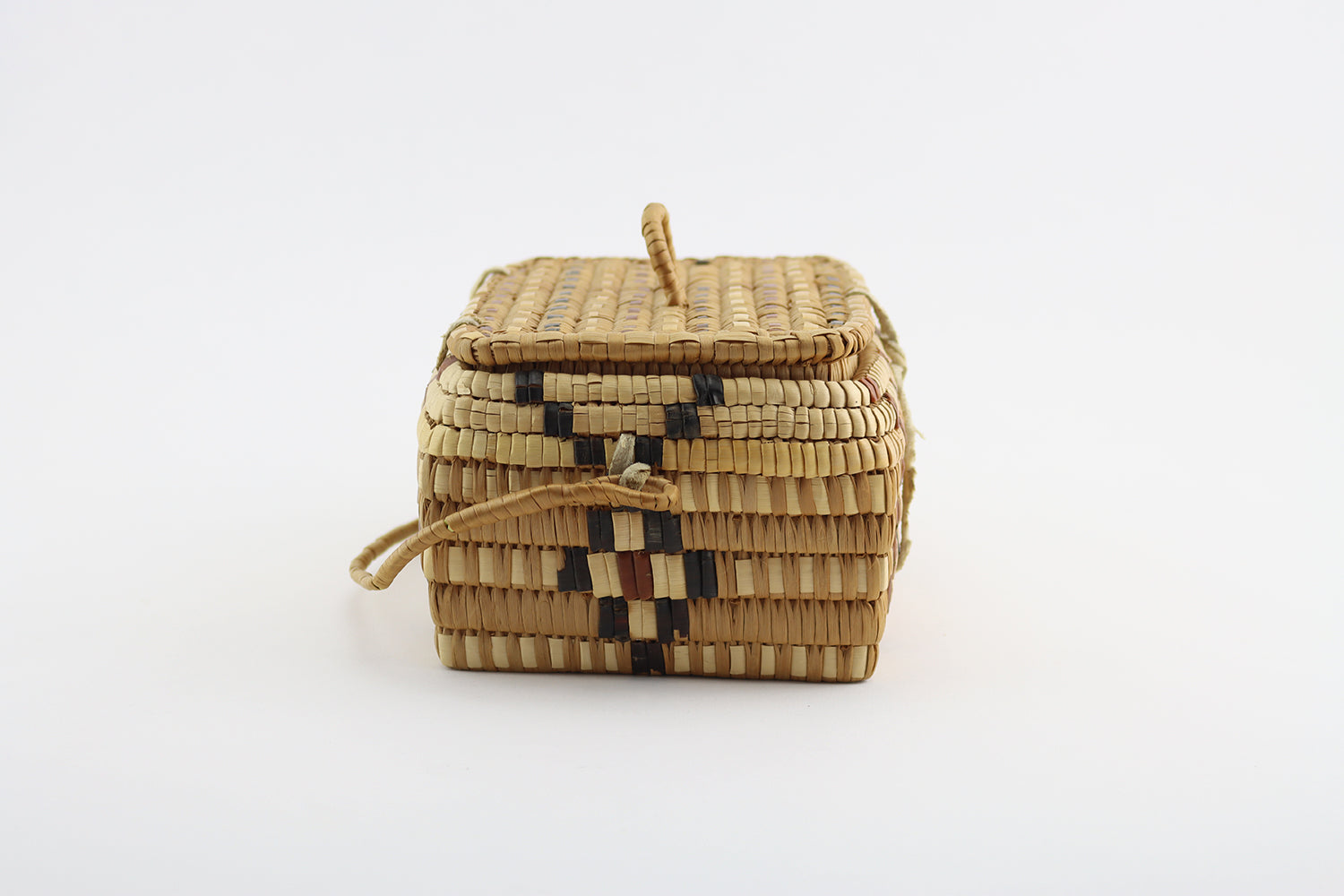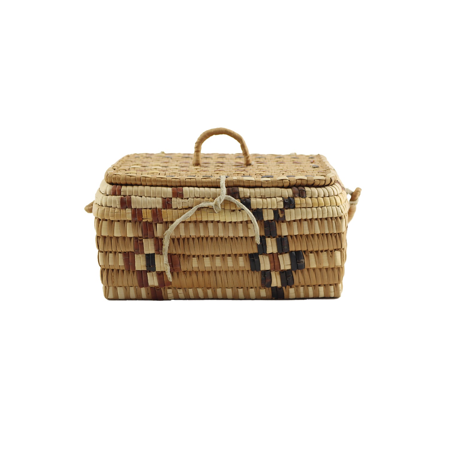 Rectangular Salish lidded cedar root lidded basket with handle, mid 20th century