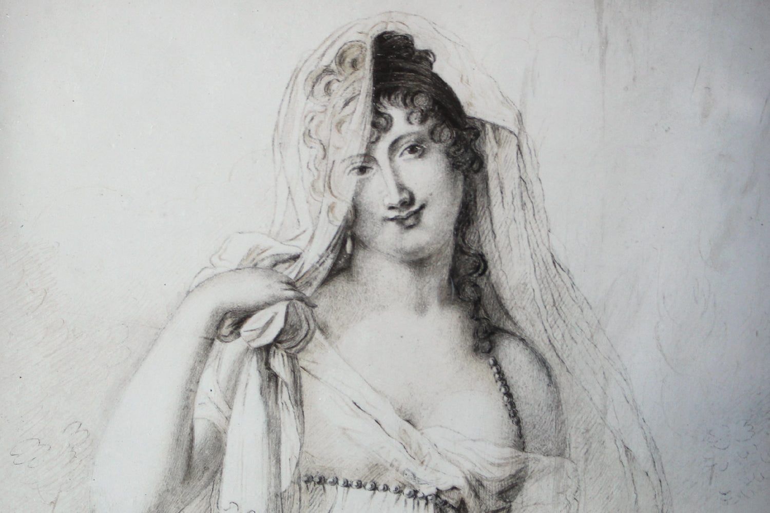 pencil on paper, early 19th century copy of Richard Cosway "Madame Recamier (1777-1849)" from 1804, in ornate wooden carved frame, unsigned, possibly by Chinese artist Falqua