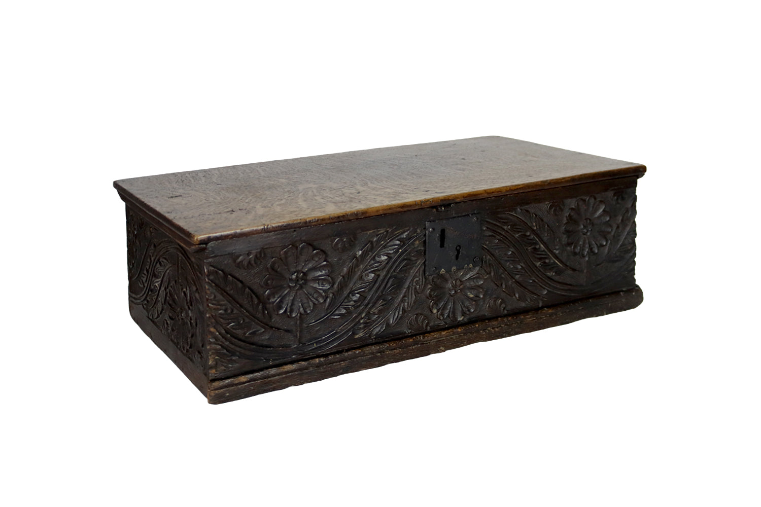 Carved wooden oak bible box with hinged lid, English 18th century is backordered and will ship as soon as it is back in stock.