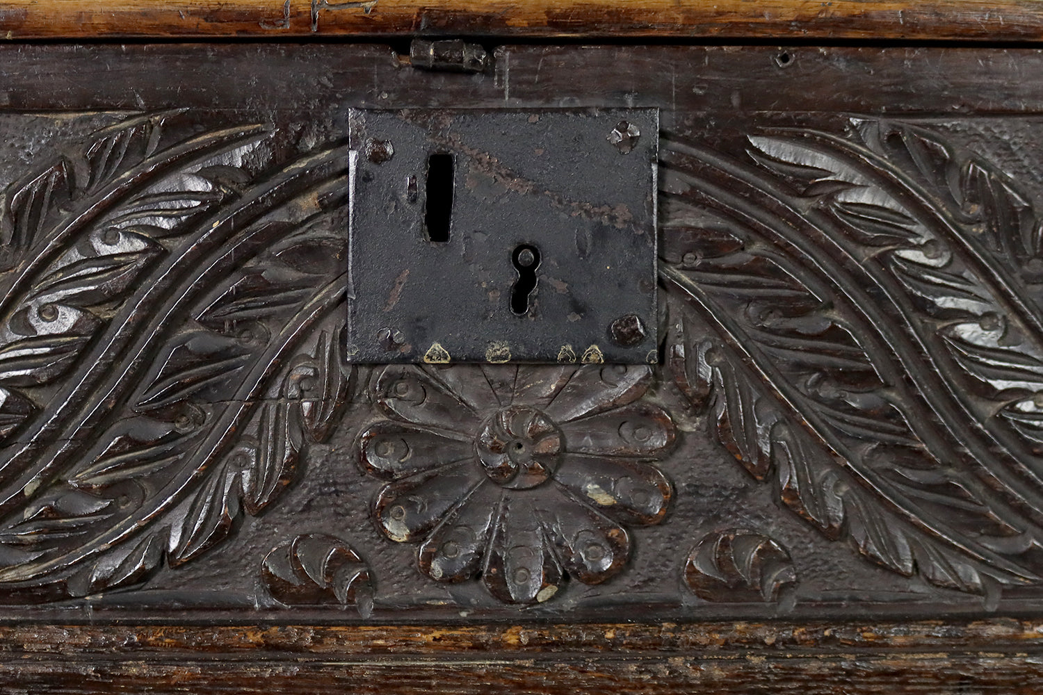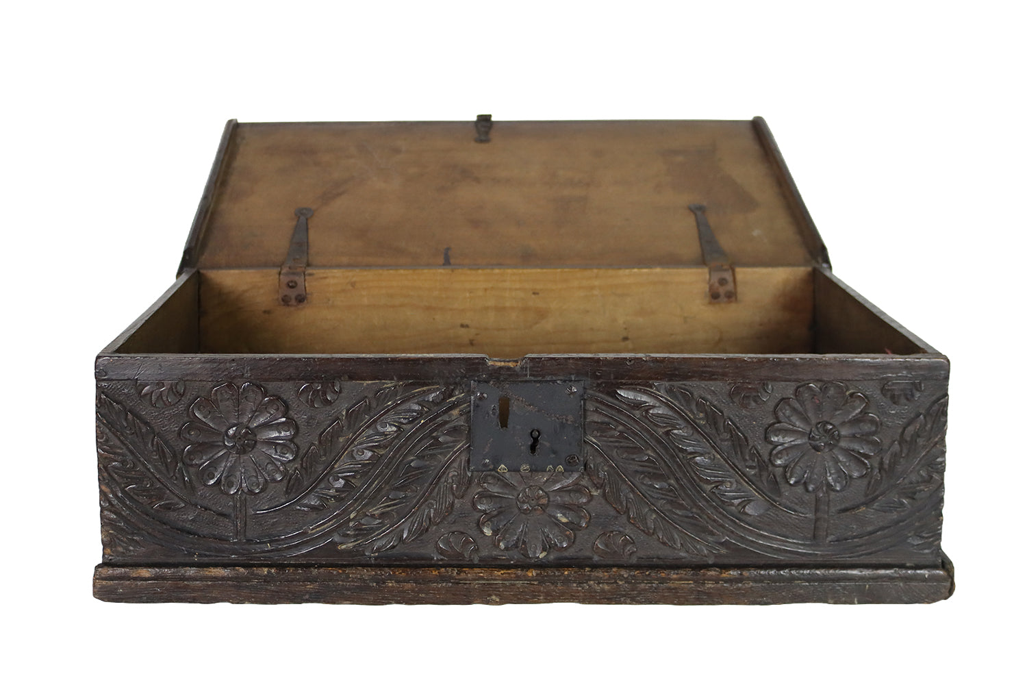 Carved wooden oak bible box with hinged lid, the front and sides decorated with scrollwork carving, with vintage lock and hinges, on later stand, English 18th century